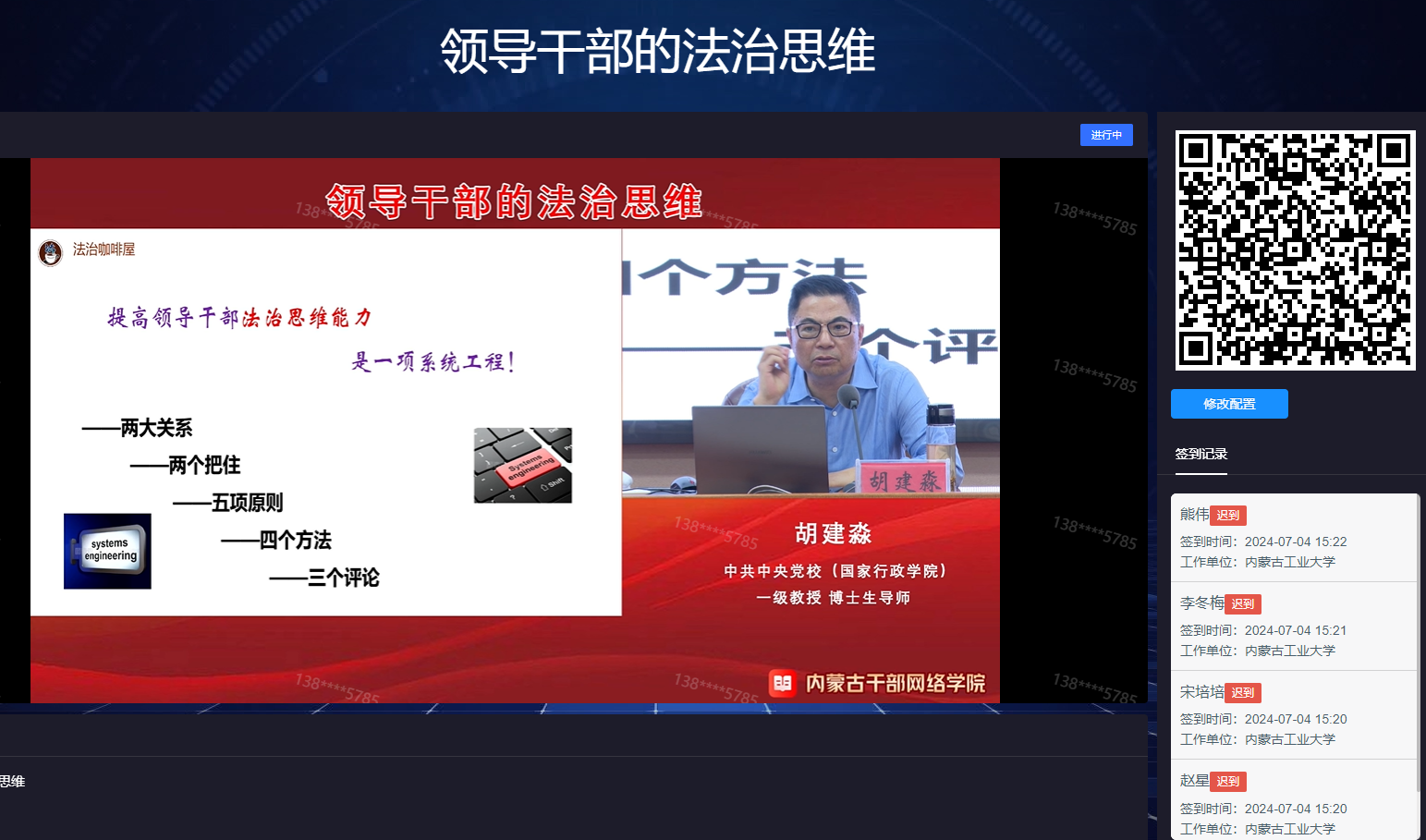 直播课上,胡建淼教授从历史的角度出发,分析了法治在中国发展历程中的地位与作用,结合国内外案例,生动阐述了法治思维对于国家治理体系和治理能力现代化的重要意义。他特别强调,党员干部应成为法治建设的引领者和践行者,通过树立正确的法治观念,引领全社会形成尊法、学法、守法、用法的良好风尚。