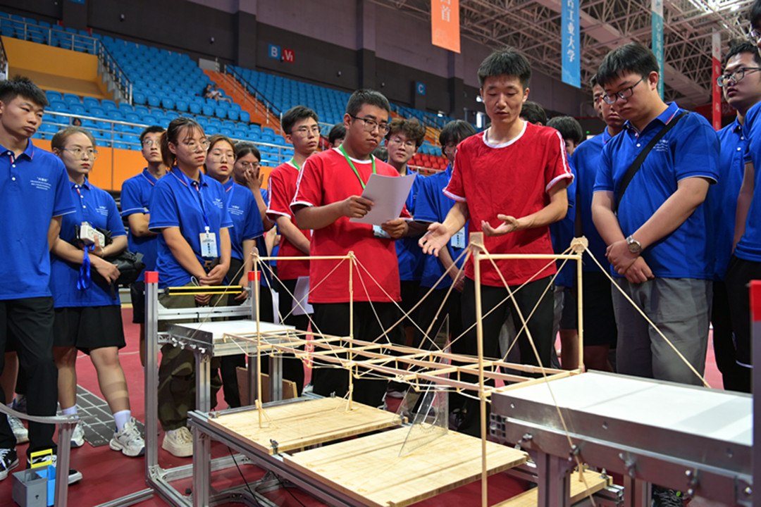本次竞赛以“撞击荷载下变参数两跨四车道桥梁结构设计与制作”为题,重点考查参赛者的计算机建模能力、多荷载工况组合下的结构优化分析计算能力、复杂空间节点设计安装能力等,来自区内5所高校的20支队伍参赛。评审专家组综合评审各团队参赛作品并加载试验,针对模型制作质量和结构体系给出指导意见。