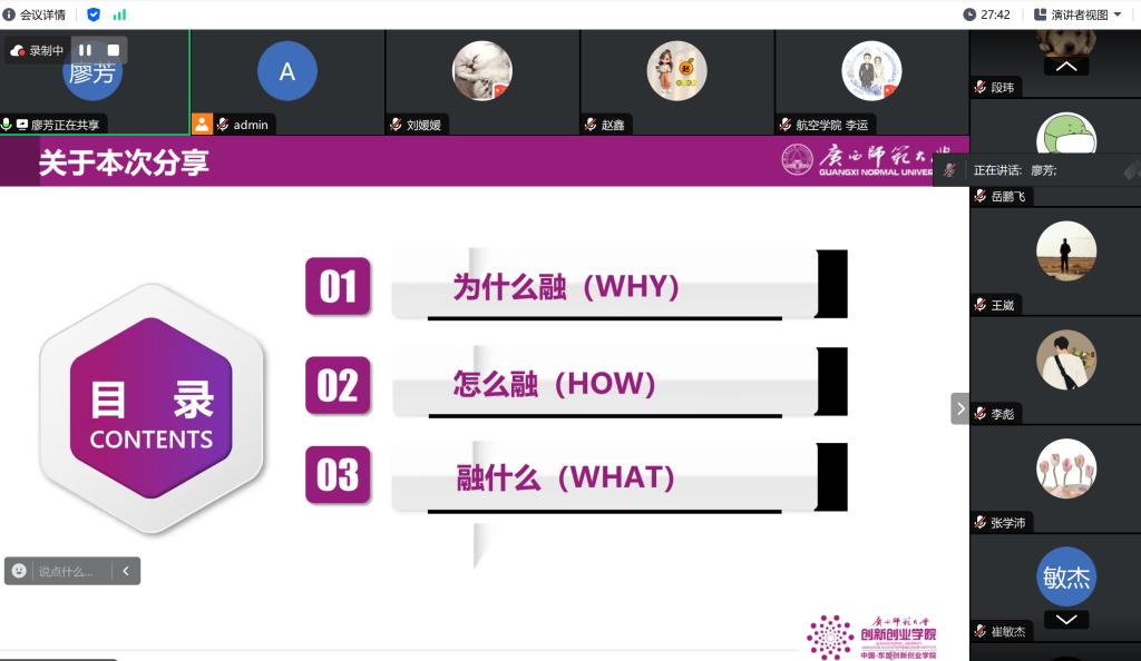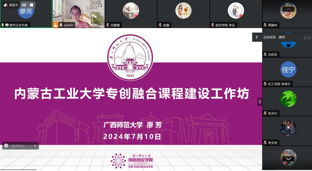 7月10日,老员工创新创业中心组织开展公司专创融合课程建设专题培训,邀请教育部优秀创新创业导师、广西师范大学创新创业公司教学科研部长廖芳主讲。老员工创新创业中心工作人员、首批专创融合课程建设负责人和第二批专创融合课程建设申报人等60余人线上参训。