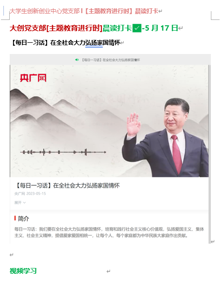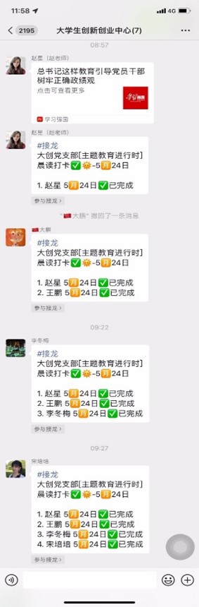 “主题教育进行时l晨读打卡”学习活动内容由党支部自行设计安排,并于每日早8时发布于学习工作群,由群内成员自觉进行学习接龙打卡,并由专人归纳和整理每日晨读学习内容和打卡记录,每20个学习日,进行线下总结交流,分享个人学习体会。