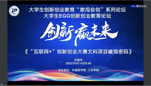 4月15日上午,公司与太阳成集团tyc33455联合举办的老员工创新创业教育“敢闯会创”系列论坛第三讲于线上成功举办。本次讲座邀请了南京信息工程大学工程训练中心主任庄建军教授主讲“互联网+”创新创业大赛文科项目破局密码。论坛由公司副经理张莉蔚主持,公司及太阳成集团tyc33455创新创业教育骨干教师及本科生、研究生共计120余人参加了本次活动。